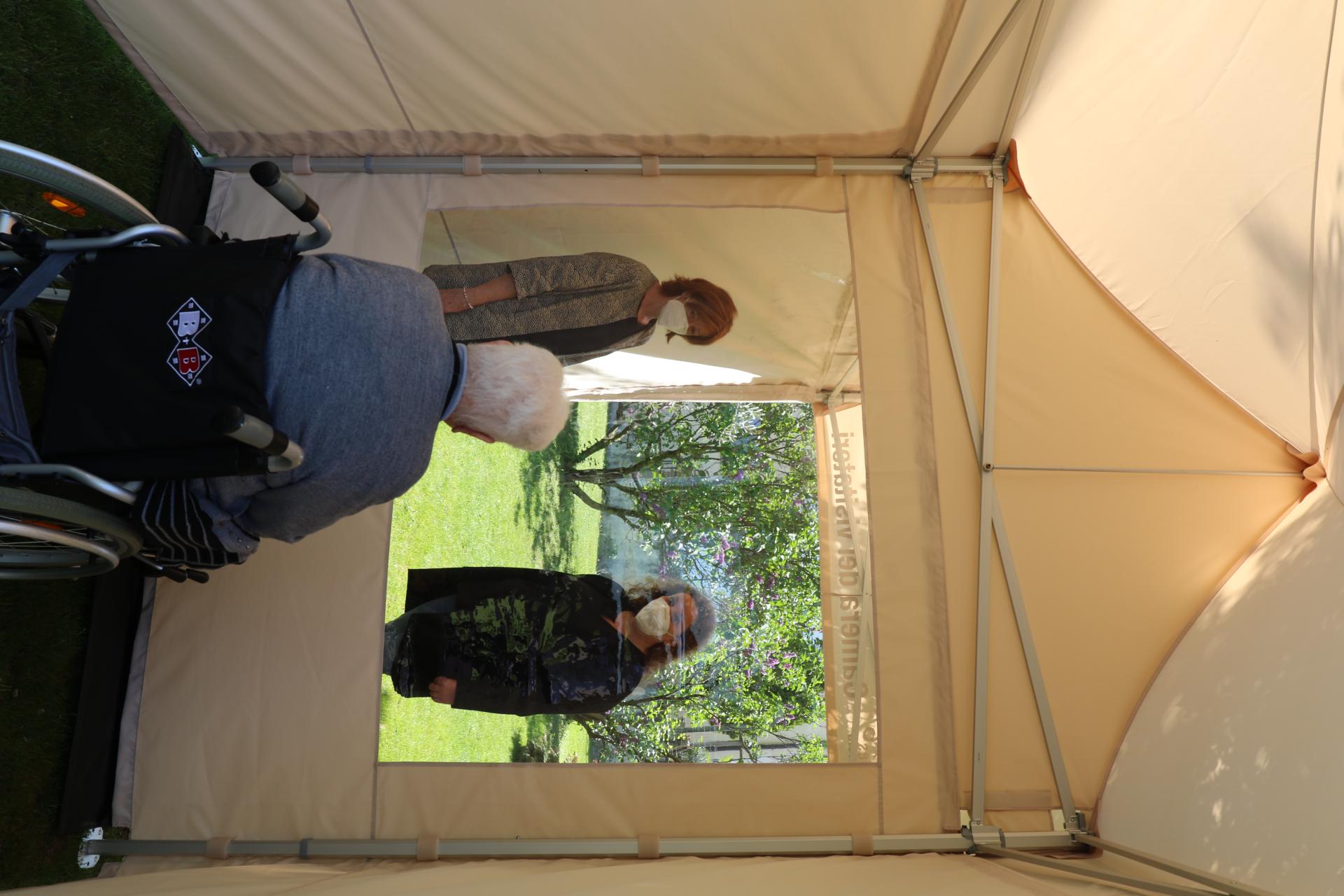 Dabei wird ein Faltzel der Größe 4x2 m aufgestellt, das in der Mitte mittels einer transparenten Schutzwand das Zelt in zwei Teile unterteilt. So kann ein Zusammentreffen von Besuchern und Heimbewohnern kontaktlos und sicher stattfinden.